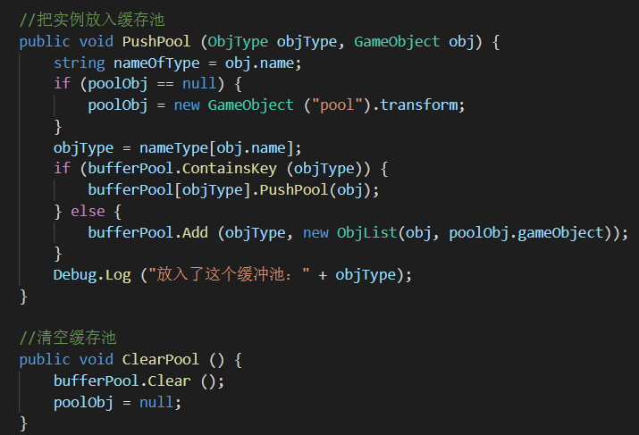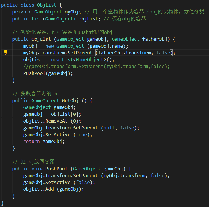 二、ObjList.PushPool()方法应该把对象保存到list容器内,并设置active为false,作为优化,可以在加入缓存池的时候,分类设置父物体,方便管理。
