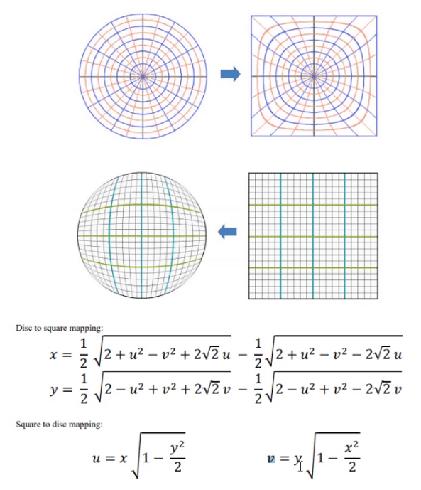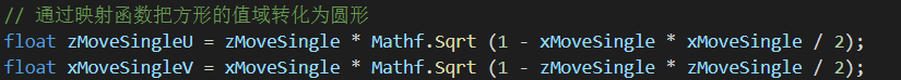 这样一来,信号就能平滑的过渡了。但是这里又有另外一个问题:手柄每一个方向的最大信号大小都是一样的,我们设为1 ,但是在键盘的信号,如果我们同时按住w和d,两个信号经过合成后,大小为√2,如果我们用信号大小乘以速度作为人物实际的移动速度的话,显然在这种情况下速度是过大的。于是我们需要一种方法,把我们在正方形范围内的信号映射成圆形的范围,具体公式如下:
